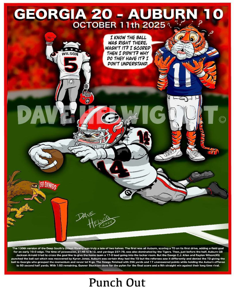 University of Georgia 11x14in. artwork by Dave Helwig recaps the incredible Superman TD dive by Gunner Stockton Dawg against the Auburn Tigers. Go Dawgs!